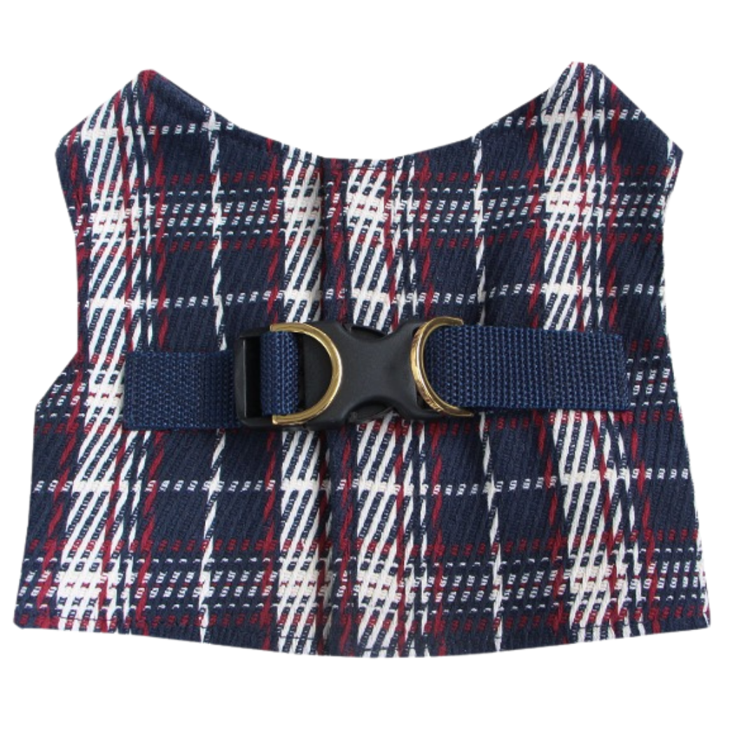 Fechamento em velcro, mosquetão e engate para guia (proteção tripla)